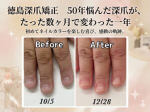 徳島で深爪矯正を最も多く施術している専門ネイリスト。リピート率90%以上、2ヶ月先まで予約が入る人気サロンです。お一人おひとりの悩みに寄り添い“隠したくない手元”へ導きます。
