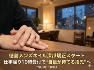 徳島で深爪矯正を最も多く施術している専門ネイリスト。リピート率90%以上、2ヶ月先まで予約が入る人気サロンです。お一人おひとりの悩みに寄り添い“隠したくない手元”へ導きます。
